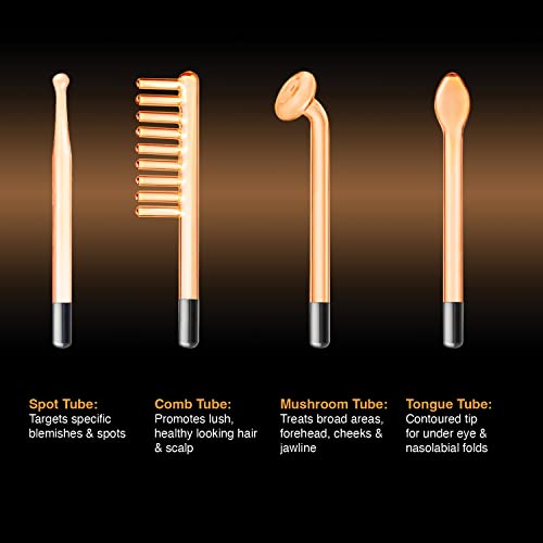 Anti-Aging Neon Applicators – The four included Neon powered applicators deliver targeted skin boosting benefits, no matter your skin type. High Frequency sessions energize and oxygenate the skin to increase cellular activity – It’s like a workout for your skin. With regular use you’ll notice the reduced appearance of fine lines and wrinkles over the years. You should definitely pre-apply a facial serum to avoid skin irritation. Please discontinue use if you experience any skin sensitivity or irritation.